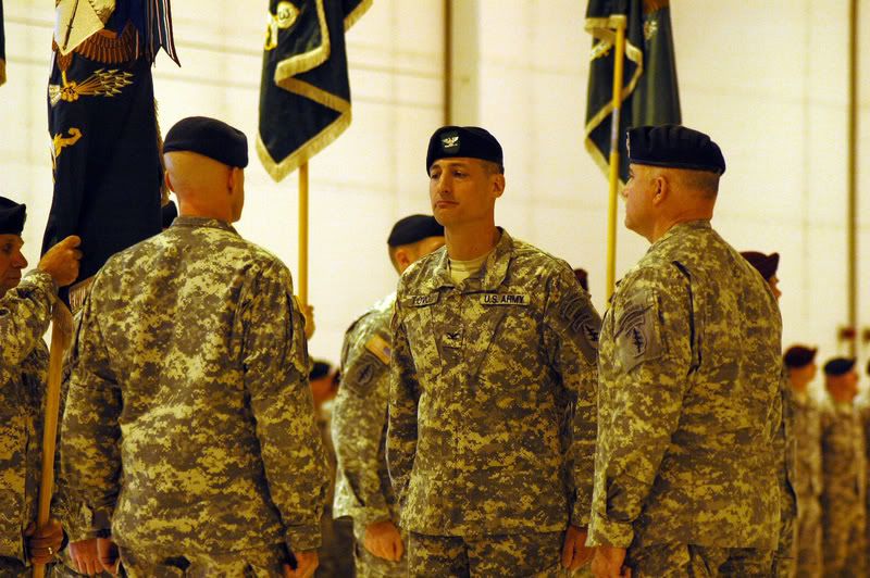 Col. Kenneth Tovo relinquishes command to Col. Darsie Rogers, Commander of 10th Special Forces Group (Airborne), during the change-of-command ceremony, Nov. 29. (U.S. Army Photo by SSG Michael Noggle)