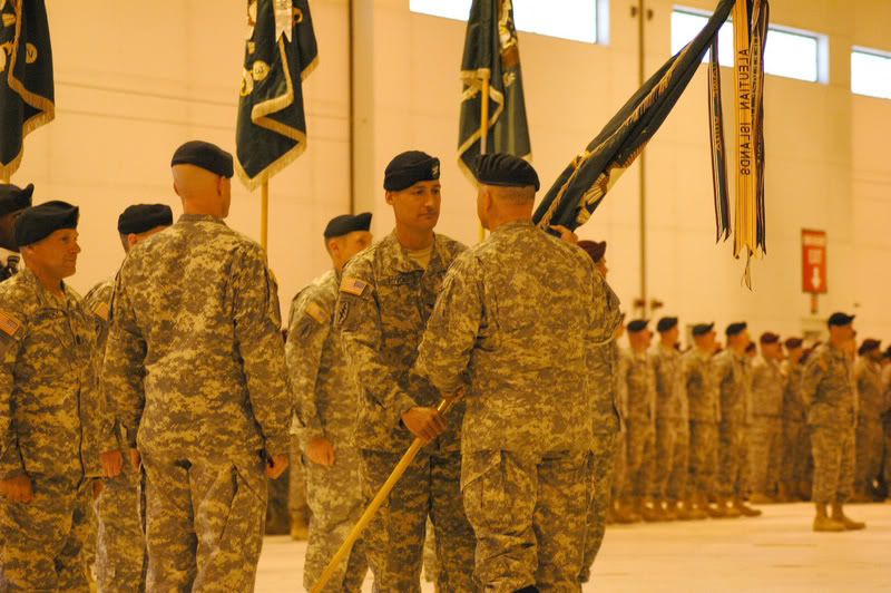 Col. Kenneth Tovo passes the 10th Special Forces Group (Airborne) colors to Maj. Gen. Thomas R. Csrnko, Commander of the United States Army Special Forces Command (Airborne) during the change-of-command ceremony, Nov. 29. (U.S. Army Photo by SSG Michael Noggle)