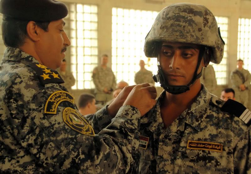 FOB VOLUNTEER, Iraq (November 27, 2007) - A member of the Iraqi National Police receives shoulder boards during a National Police Team Leader Course graduation ceremony promoting him to a non-commissioned officer on Forward Operating Base Volunteer in Baghdad, Iraq, Nov. 8, 2007. The course is a leadership program provided by a National Police Transition Team. Photo by Spc. Nicholas A. Hernandez, U.S. Army.