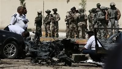 U.S. Army soldiers and Iraqi security forces secure the area of a roadside bomb attack near Tayaran Sq. in central Baghdad, Monday, April 14, 2008. The explosion was caused by a roadside bomb targeting a police patrol, missing it and hitting a minibus, killing 4 and wounding 8, police said.(AP Photo/Hadi Mizban)