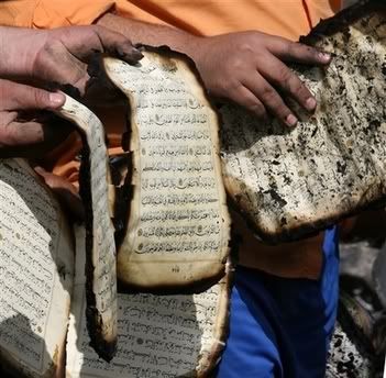 Residents carry pages from the book of the Quran after their shop burned down in eastern Baghdad, Monday, April 14, 2008. Several shops at the market in eastern Baghdad were set on fire after a road side bomb struck a US humvee vehicle, police said giving no information about casualties.(AP Photo/Hadi Mizban)