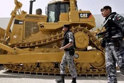 Policemen walk past a bulldozer on display at the 5th International Trade Fair for the Rebuilding of Iraq in Amman April 14, 2008.REUTERS\Muhammad Hamed (JORDAN)