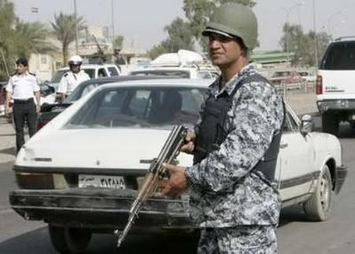 Policemen secure a police checkpoint after an attack in eastern Baghdad April 14,2008. A rocket attack that targeted a police checkpoint killed two passengers inside a bus and wounded six others near the Technological University in eastern Baghdad, police said.REUTERS/Ceerwan Aziz (IRAQ)