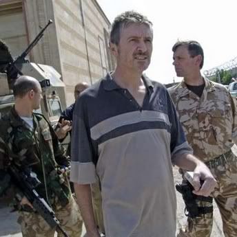 British journalist Richard Butler (C) walks with British (R) and Iraqi (L) military officers in an Iraqi army camp in Basra, 550 km (342 miles) south of Baghdad, April 14, 2008. Butler, who was held for two months by kidnappers in the southern Iraqi city of Basra, was rescued on Monday by Iraqi forces sweeping through the city in a crackdown on militants, the Iraqi military said.REUTERS/str (IRAQ)