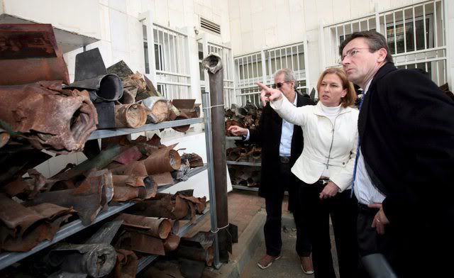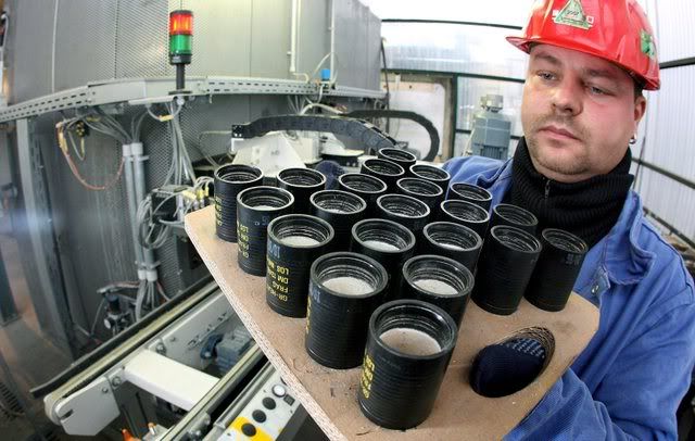 Employee Christian Gierschik of the Nammo Buck corporation shows cluster bomb warheads of NATO M26 rockets in Pinnow, eastern Germany, 21 January 2008. Around 50,000 rockets of this type, formerly in use with the Dutch and British armed forces, will be disposed by Nammo Buck. The contract with the NATO Maintenance and Supply Agency (NAMSA), worth 30 million euros, is bound to run for the next three years with an option for further four years