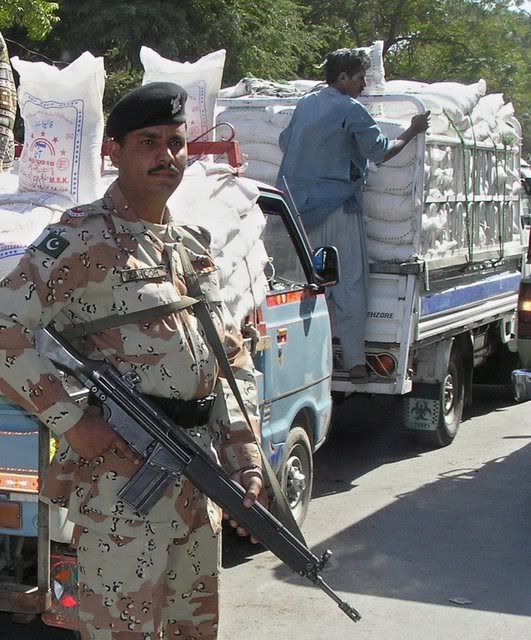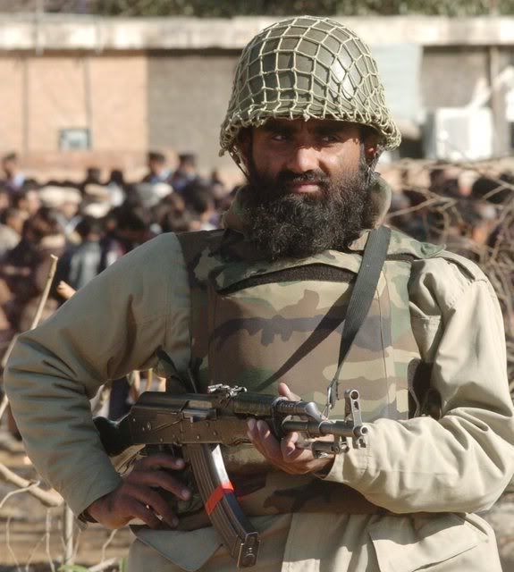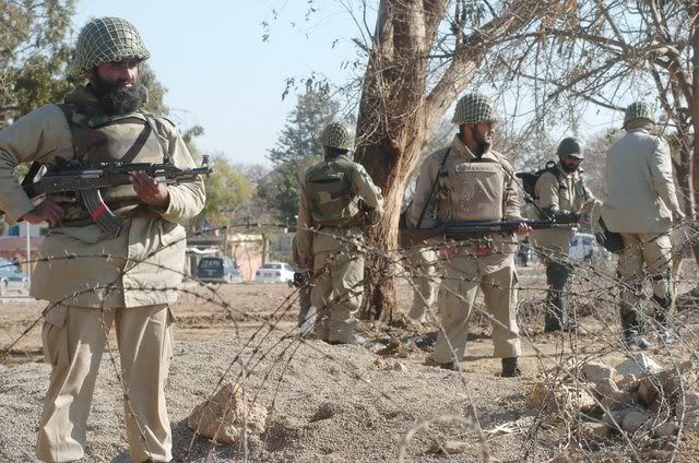 Pakistani soldiers guard a Shi'ite Muslim mourning procession, a day ahead of Ashura festival in Islamabad Pakistan 19 January 2008. Security has been intensified across the country after a suicide bomber detonated explosives strapped to his body at a Shi'ite Muslims congregation in Peshawar killing nine persons on 17 January 2008. The climax of Moharram is the Ashura festival commemorating the martyrdom of Imam Hussein a grandson of the Prophet Mohammed in the Iraqi city of Karbala in the seventh century