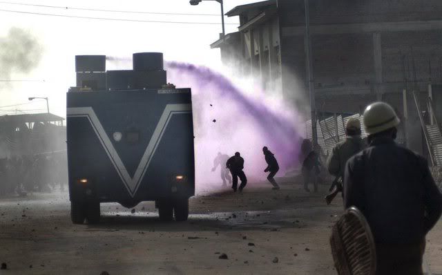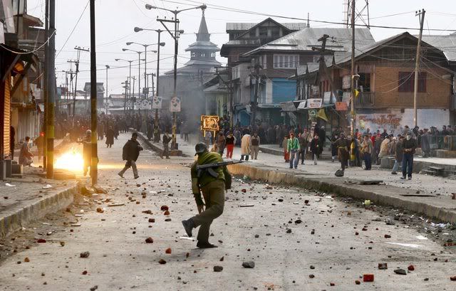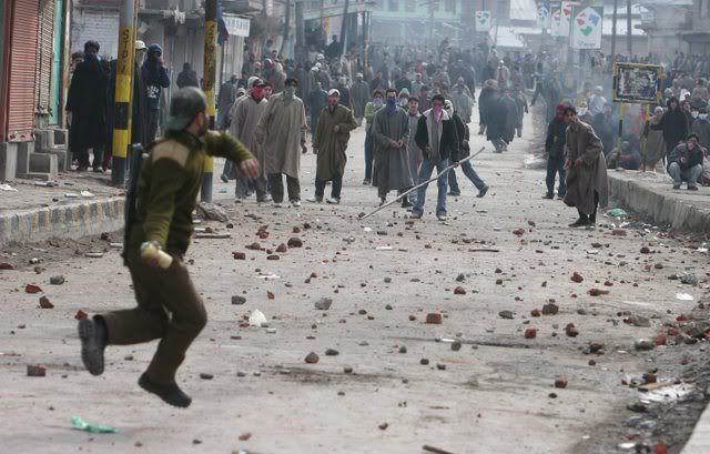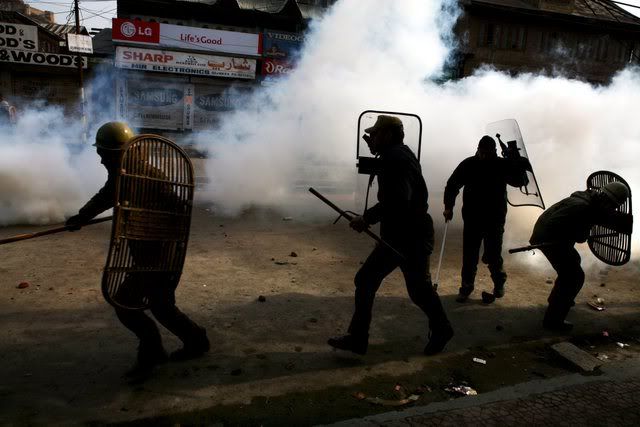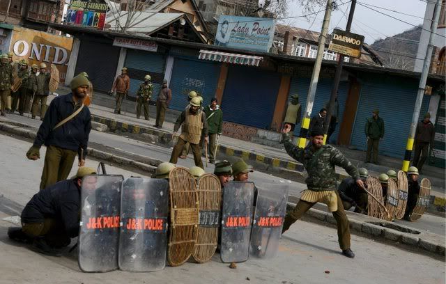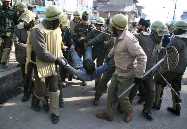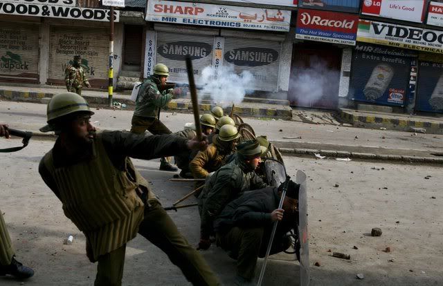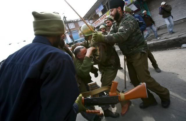 Indian policemen beat an elderly Kashmiri milkman after he was dragged from his shop on the second consecutive day of clashes between Kashmiri muslim protesters and Indian police in downtown Srinagar, India, 21 January 2008. Indian police on Monday fired in the air and used hundreds of tear gas shells and batons to disperse hundreds of angry protesters after sectarian clashes that broke out on Saturday evening between Shiite and Sunni groups. At least eight police personnel and scores of protesters were injured during these clashes