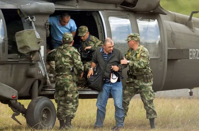 Colombian auditor of the Company Sofasa Oscar Velez Rueda (2-R), kidnapped 18 January 2008 by Revolutionary Armed Forces of Colombia (FARC), and businessman Carlos Alberto Uribe (2-L), kidnapped 16 July 2007 by the same guerrilla group, disembark from a military helicopter after being rescued by the National Army of Colombia at Urrao, Colombia, 19 January 2008. During the rescue operation a kidnapper was killed.
