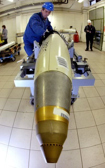 Employee Manfred Bradke of the Nammo Buck corporation works on a NATO M26 rocket with a cluster bomb warhead in Pinnow, eastern Germany, 21 January 2008. Around 50,000 rockets of this type, formerly in use with the Dutch and British armed forces, will be disposed by Nammo Buck. The contract with the NATO Maintenance and Supply Agency (NAMSA), worth 30 million euros, is bound to run for the next three years with an option for further four years