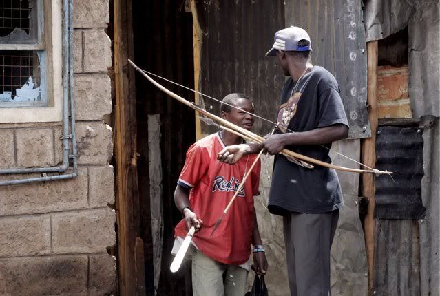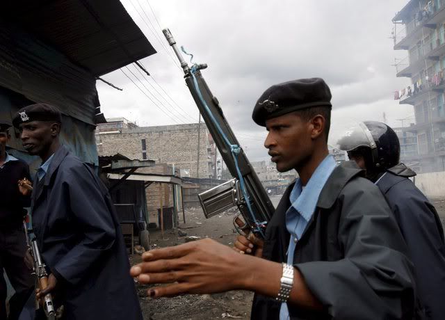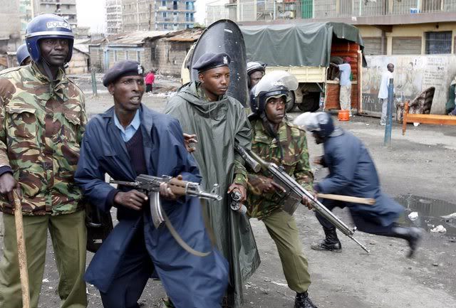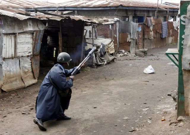 Kenyan policemen take cover from stones thrown by fighters loyal to the opposition during an operation to separate them from government supporters in Mathare slum of Nairobi on 20 January 2008. Renewed ethnic fighting broke out in a Kenyan slum following the deaths of more than 20 people in demonstrations against the disputed re-election of President Mwai Kibaki while the police fought running battles in an attempt to keep the feuding parties away from each other