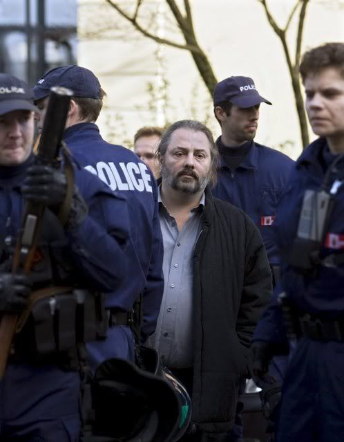 Veteran activist Giovanni 'Fashion' Schumacher (C), is being arrested by riot police during a demonstration to protest the upcoming World Economic Forum at Davos, taking place from January 23, in Bern, Switzerland, 19 January 2008