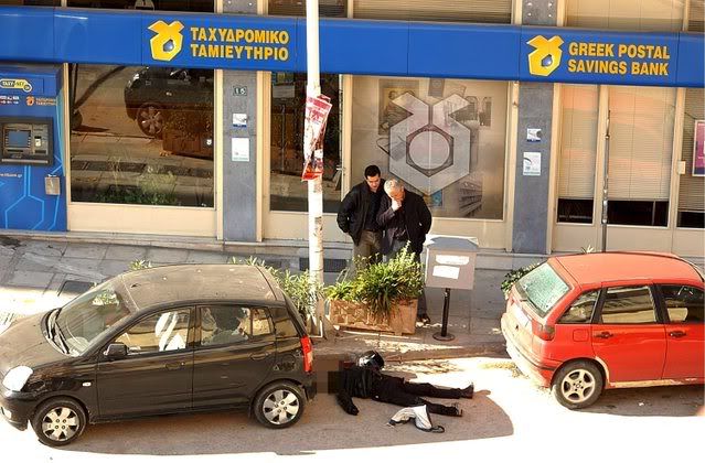 The scene outside a postal lbank branch in Athens 21 January 2008 as a man lays dead after being shot by a security guard. The dead mana, who was armed, was killed by a guard as he and an accomplice attempted to make a getaway after the hold up. The accomplice managed to escape with an unknown quanity of money