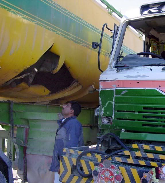 A Pakistani man looks at an oil tanker, which was transporting oil to NATO forces in Afghanistan through Pakistan-Afghanistan border post of Chaman, after it was damaged by a remote controlled bomb blast at Chaman, Pakistan 21 January 2008. Over the last three or four months tankers carrying oil for NATO troops have been regularly targeted on both sides of the border during its transportation. Landlocked Afghanistan receives most of its imports via the Pakistani sea port of Karachi