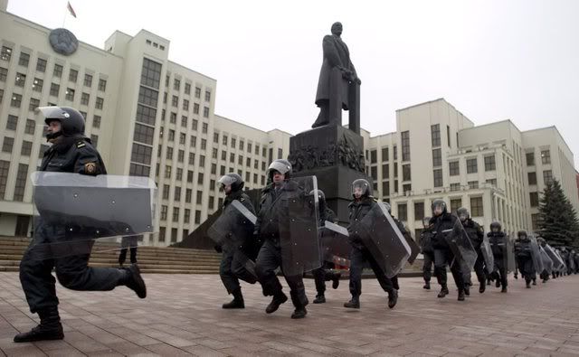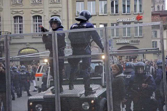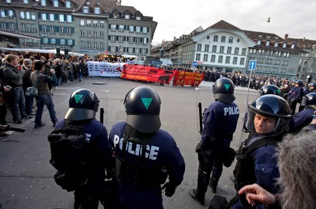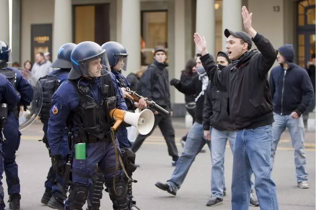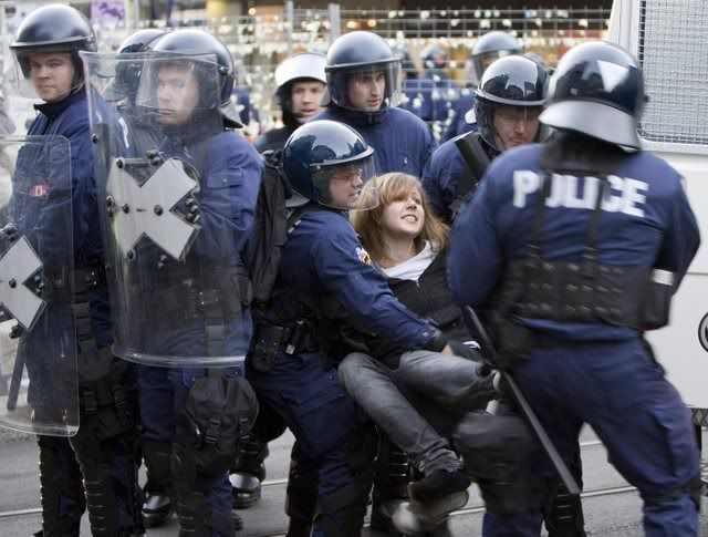 Riot police arrest an activist during a demonstration to protest against the upcoming Davos World Economic Forum, taking place from January 23, in Bern, Switzerland, 19 January 2008