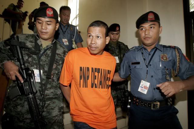 Philippine police guard fugitive Aramil Sulayman (C) after a press conference on his arrest at police headquarters in Metro Manila's Quezon City, Philippines 21 January 2008. Police tagged Aramil Sulayman as an active member of the al-Qaeda-linked Abu Sayyaf group and involved in the beheading of 10 Philippine Marines in the southern island of Basilan in July 2007