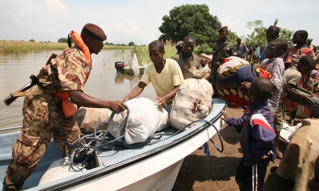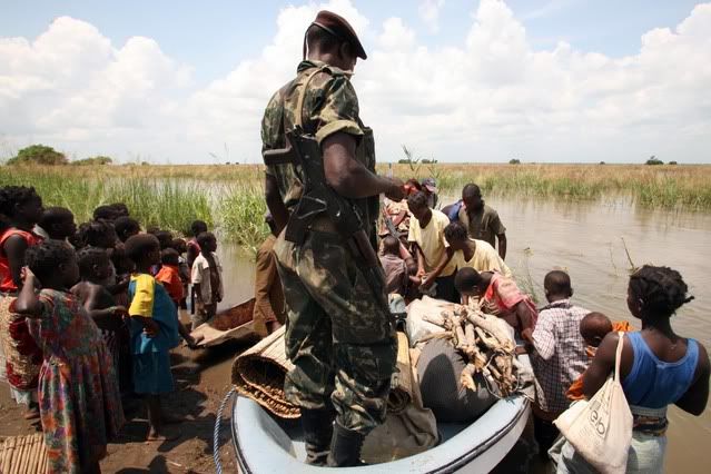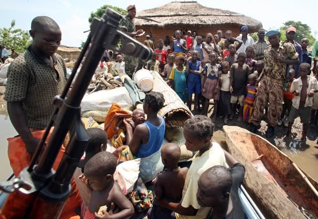 Operação de resgate na localidade de Chirembué no centro de Moçambique, devido à subida das águas do rio Zambeze. A população é transportada em pequenos barcos para zonas seguras, 20 de Janeiro de 2008. Navy Marines assist in Mozambique floods.