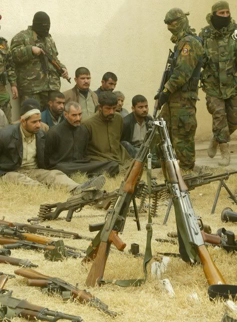 Suspected gunmen with their weapons sit at the police headquarters in Najaf, south of Baghdad on 20 January 2008. About 46 suspected gunmen were arrested by police and weapons confiscated after battles between Iraqi security forces and gunmen from the so-called 'Supporters of AL-Mahdi' in three governorates in southern Iraq, police said