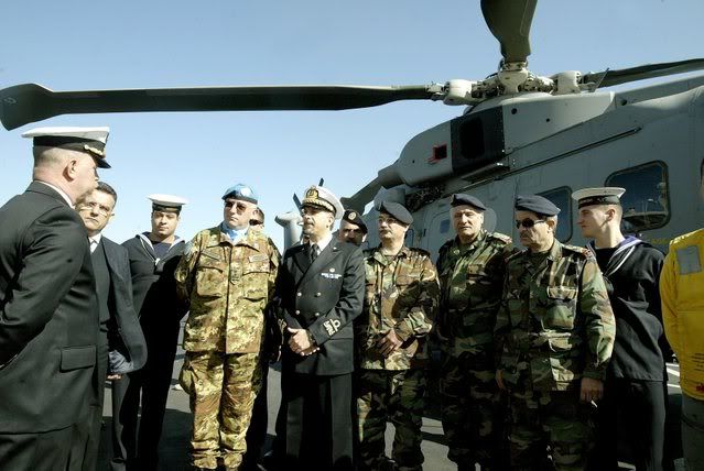 United Nations Interim Force in Lebanon (UNIFIL) commander Major General Claudio Graziano (4-L) stand with Lebanese, French and Italian ofiicers during military maneuvers off the Lebanese coastal town of Naqura, 19 January 2008. UN naval forces held joint exercises with the Lebanese military off the coast of south Lebanon. The United Nations Interim Force in Lebanon (UNIFIL) said the maneuvers in which French and Italian units are taking part started off in Naqura at the UNIFIL based, near the border with Israel
