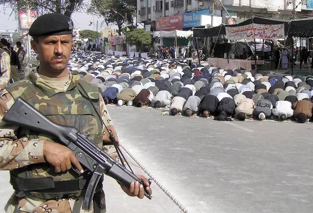 Pakistani paramilitary soldier stands guard as Shi'ite Muslim devotees pray, a day ahead of Ashura festival in Karachi Pakistan 19 January 2008. Security has been intensified across the country after a suicide bomber detonated explosives strapped to his body at a Shi'ite Muslims congregation in Peshawar killing nine persons on 17 January 2008. The climax of Moharram is the Ashura festival commemorating the martyrdom of Imam Hussein a grandson of the Prophet Mohammed in the Iraqi city of Karbala in the seventh century