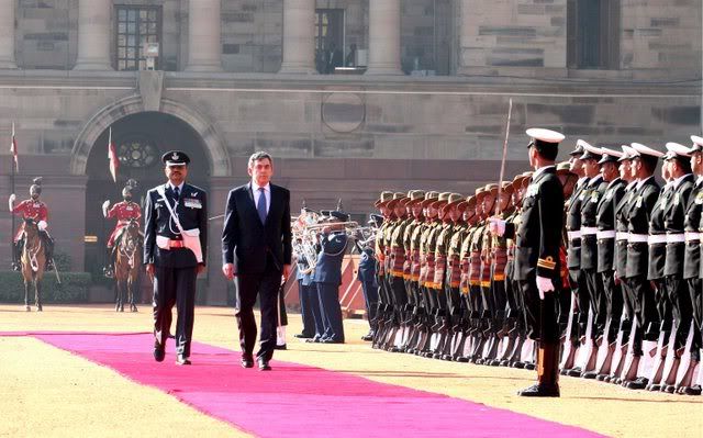 Britain's Prime Minister Gordon Brown(2 L), inspects the guard of honour at the Indian president's house in New Delhi, India on 21 January 2008. The premier is in India on a three-day visit to strengthen relationship between the two countries and scheduled to have meeting with Indian prime minister Manmohan Singh and other top politicians