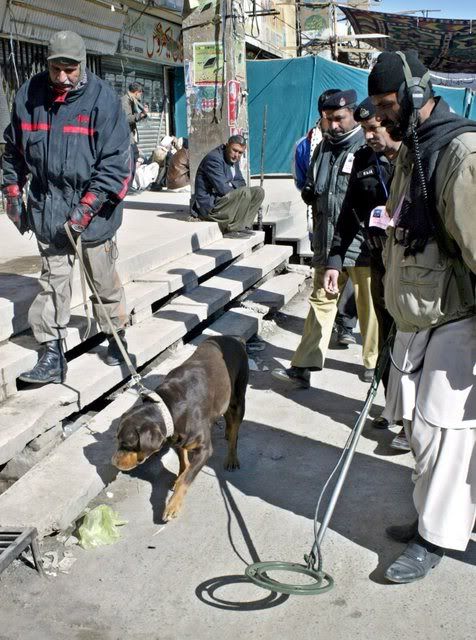 Pakistani bomb disposal squad use sniffer dogs and explosive detectors as they inspect the route of a Shi'ite Muslims Ashura mourning procession in Quetta, Pakistan, 20 January 2008. Security has been intensified across the country after a suicide bomber detonated explosives strapped to his body at a Shi'ite Muslims congregation in Peshawar killing nine persons on 17 January 2008. The climax of Moharram is the Ashura festival commemorating the martyrdom of Imam Hussein a grandson of the Prophet Mohammed in the Iraqi city of Karbala in the seventh century