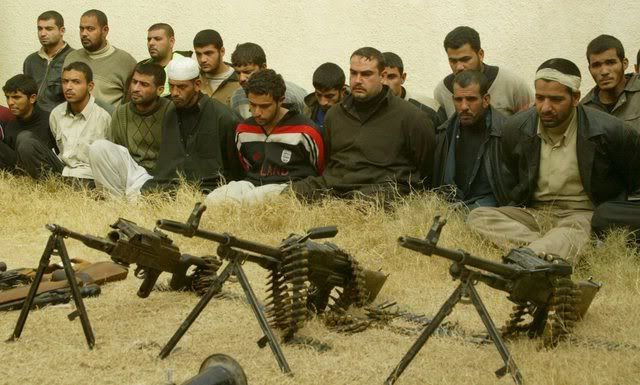 An Iraqi soldier stands guard near blindfolded suspected insurgents, at the Iraqi army base in Baquba, northeast of Baghdad on 21 January 2008 . An Iraqi army officer said that 15 suspected insurgents were arrested during a raid by the Iraqi army and U.S forces in Baquba