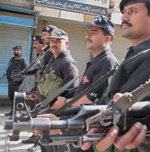 Pakistani policemen stand guard during an Ashura procession in Hyderabad, Pakistan, 20 January 2008. Security has been intensified across the country after a suicide bomber detonated explosives strapped to his body at a Shi'ite Muslims congregation in Peshawar, killing nine persons on 17 January 2008. The climax of Moharram is the Ashura festival commemorating the martyrdom of Imam Hussein a grandson of the Prophet Mohammed in the Iraqi city of Karbala in the seventh century