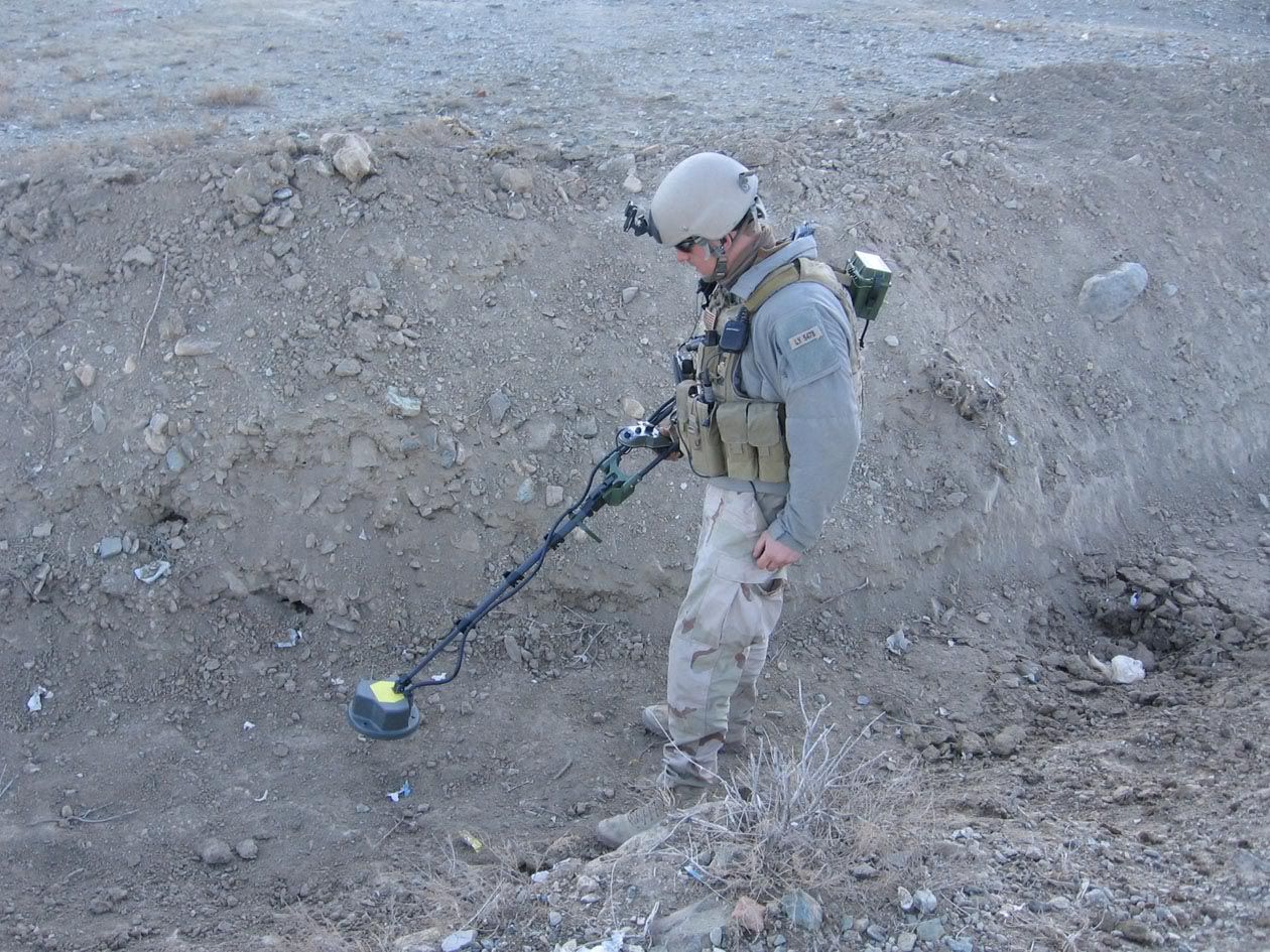 A coalition Soldier scans for unexploded ordnance after construction workers, discovered an unexploded anti-personnel mine located near an elementary school in Chamkani Village, Chamkani District, Paktya province Jan. 20. Afghan national security forces and coalition Soldiers neutralized the ordnance, making the area safe.