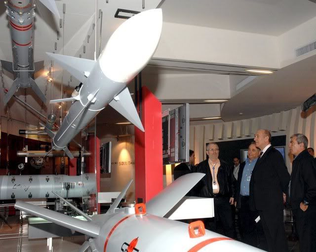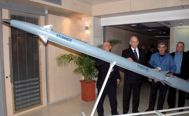 A handout photograph supplied by the Israeli Government Press Office (GPO) shows Prime Minister Ehud Olmert (2,L) as he poses with a missile, apparently called the 'Stunner,' while touring the Rafael Arms Development Authority near the northern Israeli city of Haifa, on 22 January 2008. Other people on the tour with Olmert are unidentified