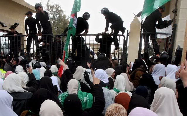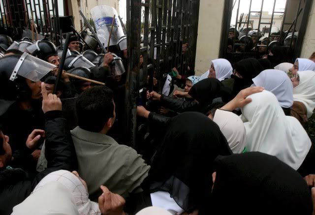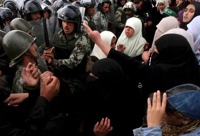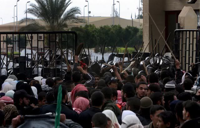 Palestinians walk into Egypt after they stormed the Rafah border crossing with the Gaza Strip 22 January 2008. Hundreds of protesters briefly broke through the border terminal, pushing back helmeted Egyptian riot police who fired in the air to try to contain the crowd.