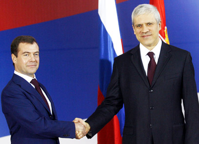טדיץ' (מימין) ומדבדב, היום בבלגרד (צילום: רויטרס)