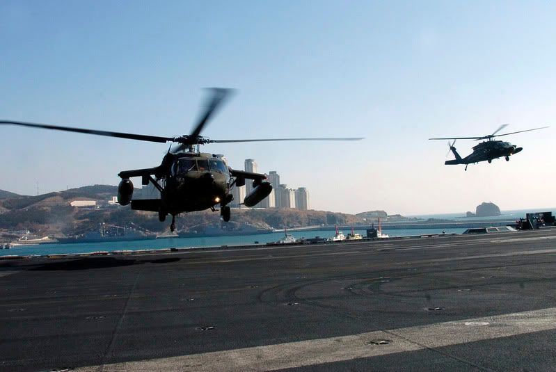 BUSAN, Republic of Korea (March 1, 2008) Commander, U.S. Forces Korea Gen. Burwell B. Bell lands on the flight deck of the aircraft carrier USS Nimitz (CVN 68) aboard a UH-60 Black Hawk helicopter during the ship's recent port visit. Nimitz is taking part in Exercise Key Resolve/Foal Eagle 2008, an annual joint exercise involving forces from the United States and the Republic of Korea. U.S. Navy photo by Mass Communication Specialist 3rd Class Jake Berenguer