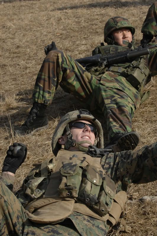 U.S. Marine Corps Cpl. Joshua Sou (foreground) participates in grenade training with Republic of Korea marines as part of Exercise Key Resolve/Foal Eagle 2008 at the Rodriguez Live Fire Range in South Korea on March 1, 2008. The annual joint exercise between U.S. and Republic of Korea forces provides training to enhance interoperability and combat readiness. Sou is attached to the 1st Light Armored Reconnaissance Battalion, 1st Marine Division from Camp Pendleton, Calif. DoD photo by Petty Officer 3rd Class Nancy C. diBenedetto, U.S. Navy. (Released)