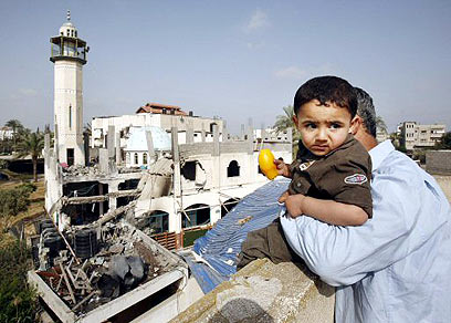 ילד פלסטיני ואביו ליד בית התפילה שנפגע בעזה (צילום: רויטרס)