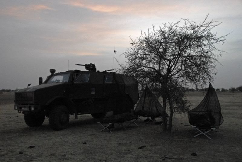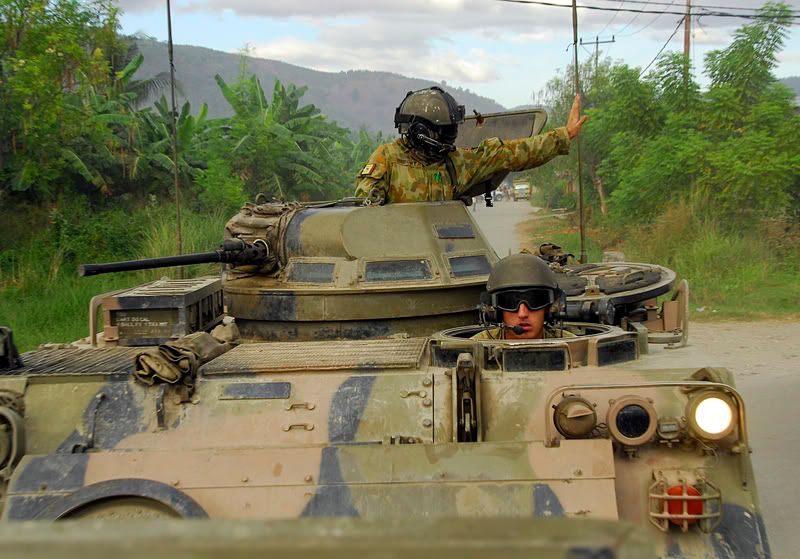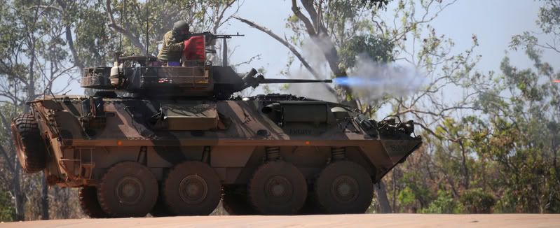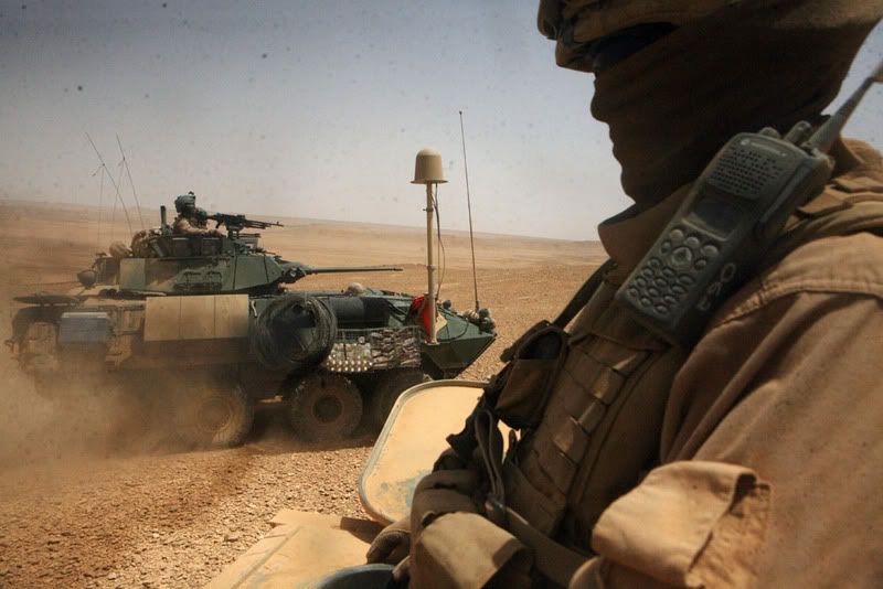 Sgt. Carl J. Woods, 24, a scout team leader from Virginia Beach, Va., with Delta Company, 2nd Light Armored Reconnaissance Battalion, Regimental Combat Team 5, watches on as a light armored vehicle passes during an assembly of an observation post, May 18. The Camp Lejeune-based company, known as "Outlaw," assisted the U.S. Navy SEALS in a raid that yielded a key suspect in Operation Iraqi Freedom.