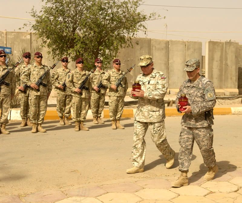 Polish Maj. Gen. Andrzej Malinowski, Commander of MND-CS and U.S. Army Col. David Matakas carry two single candles to be placed ceremoniously in front of camp head- quarters in remembrance of those who gave their lives in service to the United States of America during a Memorial Day ceremony May 26, 2008, at Camp Echo, Iraq. (U.S. Air Force photo/Airman 1st Class Matthew Plew)