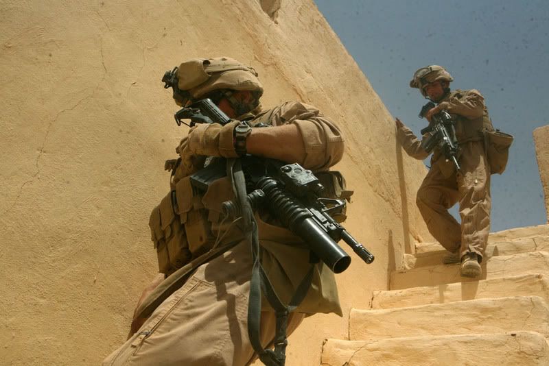 Lance Cpl. Fix, 21, a scout team leader from Cleveland, Ohio, with Delta Company, 2nd Light Armored Reconnaissance Battalion, Regimental Combat Team 5, runs down a set of stairs followed by Pfc. Bradley R. Clifton, 18, a scout from Frankfort, Ky., with Delta Company, during a patrol through western Al Anbar province, May 18. The company, nicknamed "Outlaw," supported the Navy SEALS in executing this operation to capture a key suspect, May 19, in support of Operation Iraqi Freedom.