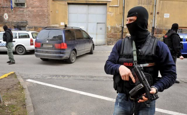 Masked policemen securing the area when the car carrying Slovakian bombing suspect Jozef Rohac arrives at one of the facilities of Hungarian Police in Budapest, Hungary on 13 February, 2009. Jozef Rohac who is suspected of carrying out at least ten bombings in Budapest in the late 1990s was extradited to Hungary from Prague earlier in the day