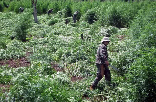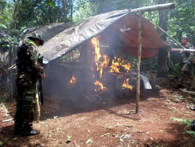 A handout photograph provided on 13 February 2009 by the National Anti-Drugs Secretary of Paraguay (SENAD, as in Spanish), shows anti-narcotics officers destroying a laboratory at a marijuana plantation in Cadete Boqueron, Amambay department, Paraguay. According to the SENAD, were detected 28 hectares of marijuana plots and were destroyed along four laboratories and two machines to pack the drug