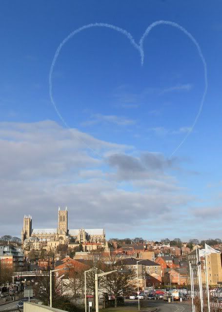 British Royal Air Force Red Arrows display team fly over Lincoln City in north east England 13 February 2009, leaving a trail of smoke in the shape of a heart to coincide with Valentine's Day tomorrow 14 February 2009