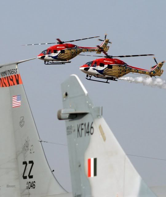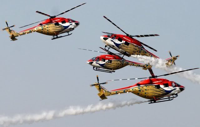 Sarangs Aerobatic Team 'Sarang' display their skills with helicopters of the Indian Air Force, at the Yelahanka Air Force Station in Southern Indian City of Bangalore, India, on 14 February 2009. Around 330 companies from 50 countries and 270 firms from India will take part in this seventh edition of the biennial international aerospace exposition, which is being hosted by the Indian Ministry of Defence from 11 to 15 February 2009