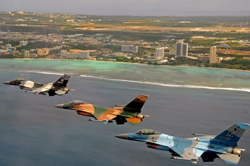 A trio of F-16 Fighting Falcons assigned to the18th Aggressor Squadron at Eielson Air Force Base, Alaska, fly in formation over Tumon Bay, Guam, during exercise Cope North 09-1, Feb. 10, 2009. Units from the U.S. Air Force, U.S. Navy and the Japan Air Self Defense Force participated in the joint bilateral exercise on Andersen Air Force Base, Guam. U.S. Air Force photo by Master Sgt. Kevin J. Gruenwald
