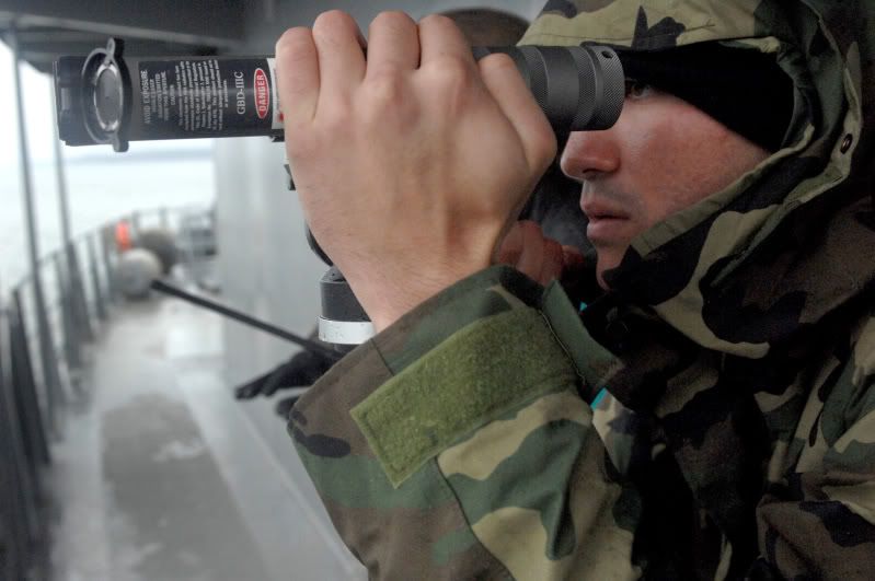 Quote: Gunner's Mate Seaman Apprentice William Sjulstad assigned to Boat Division 56, keeps watch on a surface contact while serving as forward lookou during a simulated escort of high-value asset USNS Henry J. Kaiser. (U.S. Navy photo by Mass Communication Specialist 1st Class Jason R. Brunson)