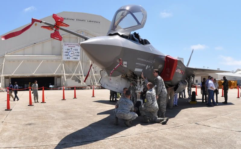 Airmen get a close-up look at the F-35 Lightning II Joint Strike Fighter test aircraft AA-1 as it sits on the ramp April 23 at Eglin Air Force Base, Fla. The aircraft's first arrival at the base was to provide a showcase to base members and the local community. (U.S. Air Force photo/Samuel King Jr.)