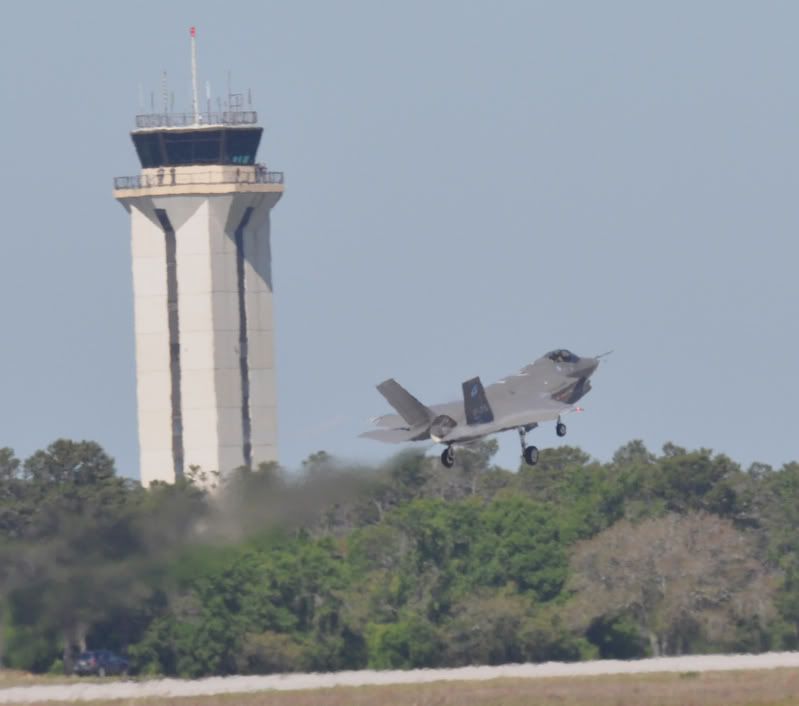 The F-35 Lightning II Joint Strike Fighter test aircraft AA-1 performs a touch-and-go maneuver April 23 at Eglin Air Force Base, Fla. The aircraft's first arrival at the base was to provide a showcase to base Airmen and the local community. (U.S. Air Force photo/Samuel King Jr.)