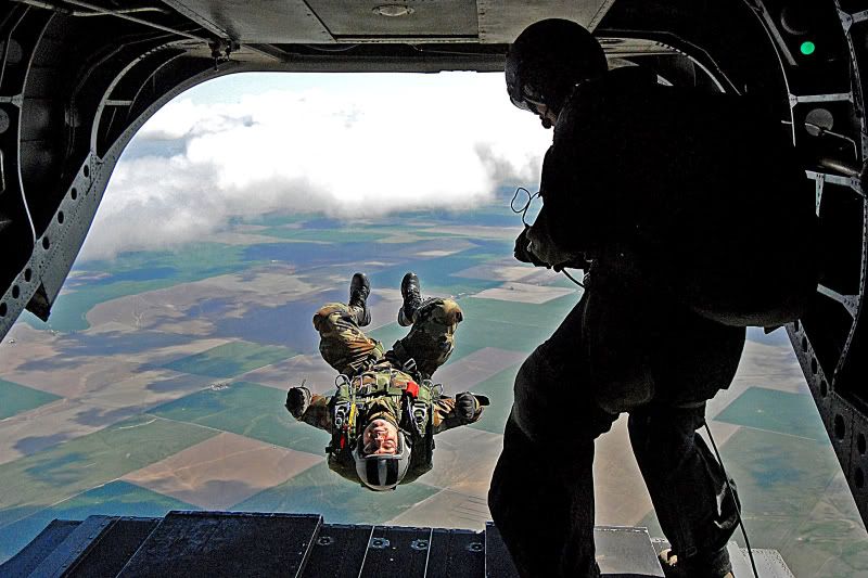U.S. Air Force Tech. Sgt. Derrick Brooks back flips from an Oregon Army National Guard CH-47 Chinook helicopter at 7,200 feet during a jump demonstration in Pendleton, Ore., April 23. 2009. Brooks is a pararescue jumper assigned to the 304th Rescue Squadron, Air Force Reserve. U.S. Air Force photo by Sgt. Eric A. Rutherford