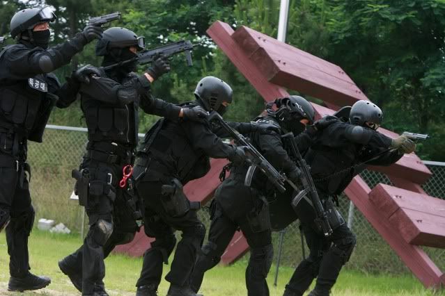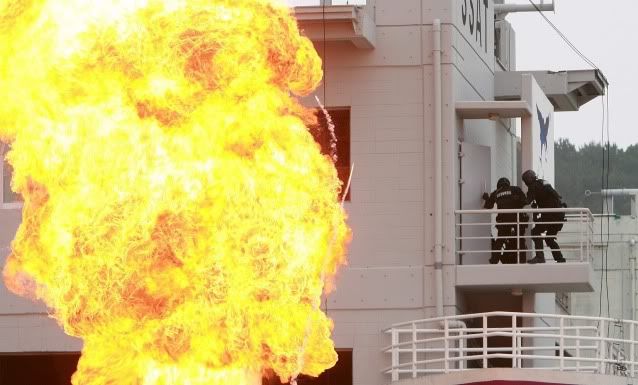 Policemen from the South Korean Coast Guard's Special Sea Attack Team (SSAT) board a patrol boat during an anti-terror exercise on their