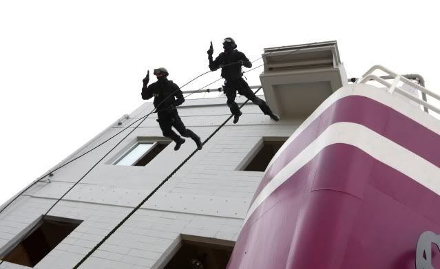 Policemen from the South Korean Coast Guard's Special Sea Attack Team (SSAT) rappel down a building during an anti-terror exercise at its