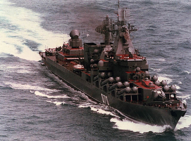 The Admiral Nakhimov, formerly named the Kalinin, is the third of the four Kirov-class heavy guided missile cruisers that was in service with the Soviet and subsequently the Russian Navy from 1980 to 1998. The vessel is capable of providing air defense and anti-submarine defense. It has a displacement of 25,800 tonnes and a crew of 759, including 120 officers.