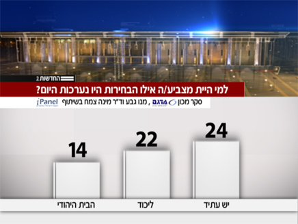 סקר שפורסם הערב (שלישי) בחדשות ערוץ 2 מצביע על כך שלראשונה "יש עתיד" היא המפלגה הגדולה ביותר בישראל. לפי הסקר, אם הבחירות בישראל היו מתקיימות היום היתה מקבלת מפלגתו של יאיר לפיד 24 מנדטים. הליכוד מאבדת כרבע ממצביעיו ויורד ל-22 מנדטים והבית היהודי היא המפלגה השלישית בגודלה עם 14 מנדטים.